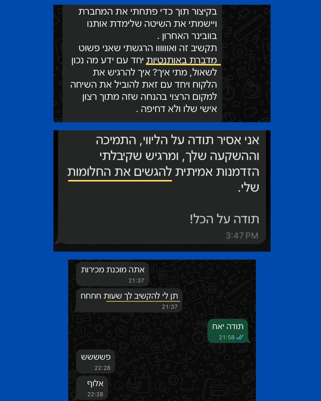 אחרי כלים רבים שרכשתי וניסוי וטעייה תוך כדי שמירה על יושרה ואתיקה הבנתי את המסלול האידיאלי. מצאתי מודל ייחודי שמגשר בין הלב לראש שמאפשר להפוך שיחת התאמה לשיחה טבעית ואותנטית כזו שמסתיימת בכך שהמתעניין פשוט מרגיש שרואים אותו. פתאום, השיחות הפכו לנעימות, קלילות ומלאות ביטחון. היומן התחיל להתמלא, והכי חשוב - השקט הכלכלי הגיע.